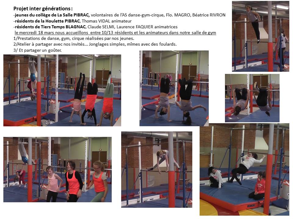 Notre 2ème Projet inter générations :-jeunes du collège de La Salle PIBRAC, volontaires de l’AS danse-gym-cirque-résidents de la Houlette PIBRAC, Thomas VIDAL animateur-résidents de Tiers Temps BLAGNAC, Claude SELMI, Laurence FAQUIER animatrices Nous nous sommes vu le mardi 24 février pour préparer ces rencontres : -le mercredi 18 mars nous avons accueillis entre 10/14…