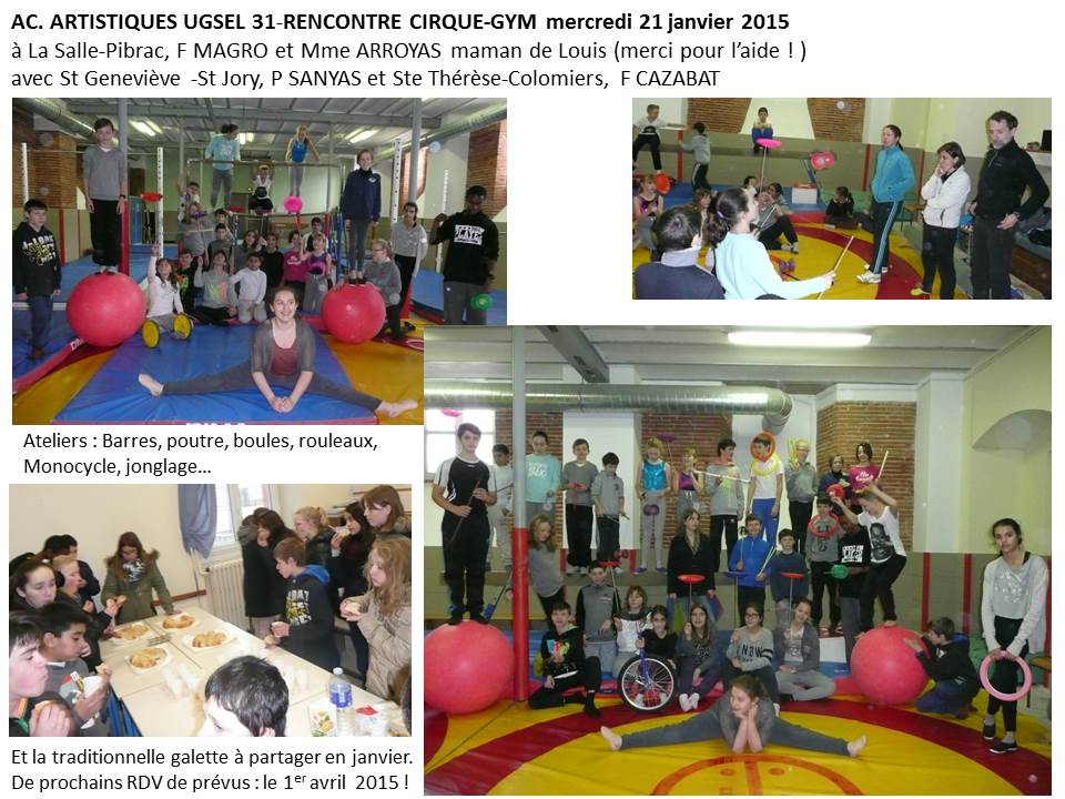 Lire la Suite Mercredi 21 janvier 2015 : Rencontre cirque gym inter établissements chez nous Pibrac (3 établissements du réseau)Pour les jeunes inscrits et venants régulièrement aux entraînements de l'AS cirque, gym, danse du collège.Prochain RDV le 1er AVRIL sur Toulouse.