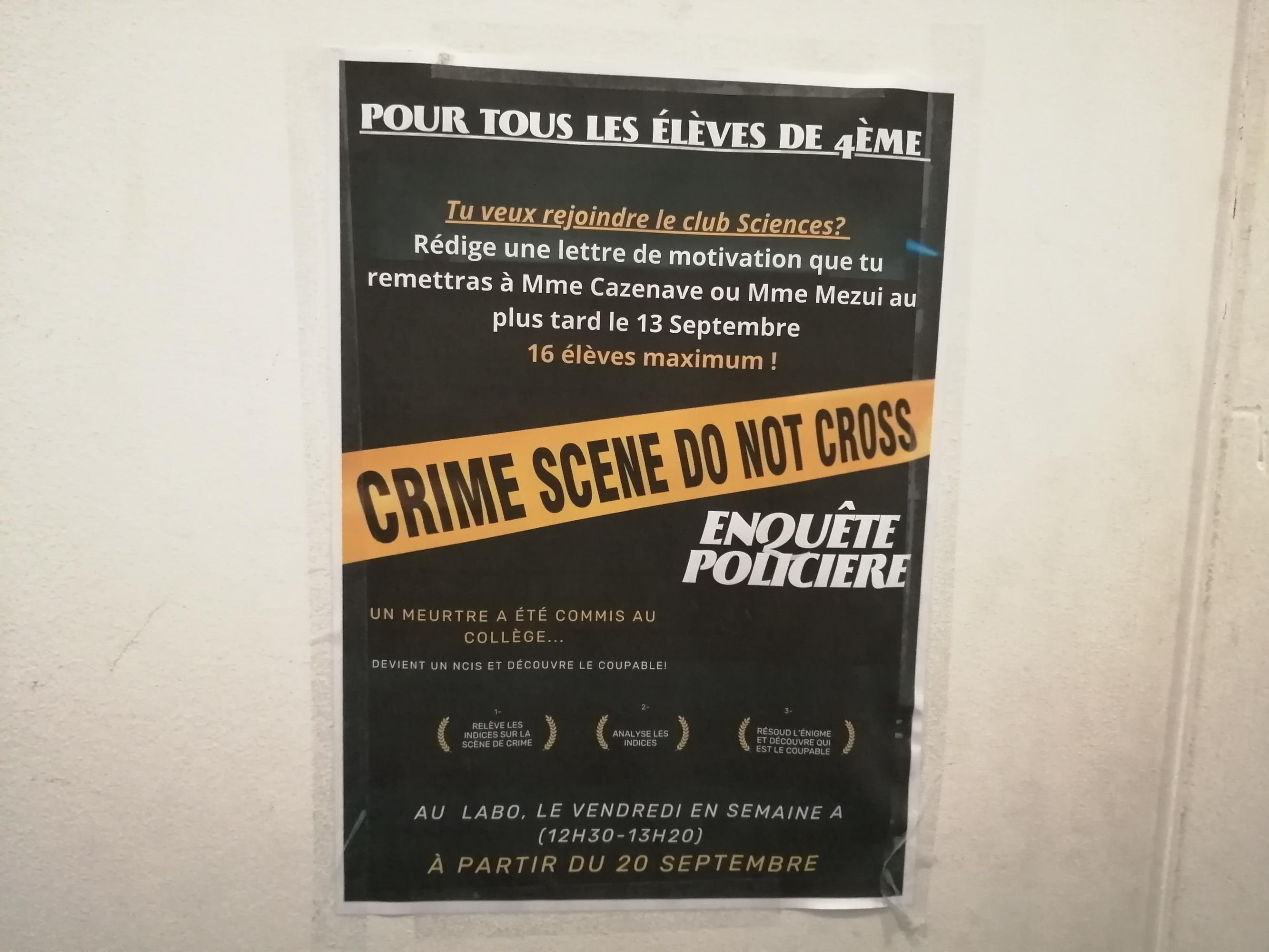 Club Sciences : Un crime fictif a été commis au collège de La Salle, les TIC du club Sciences sont intervenus vendredi dernier.Les Techniciens en Identification Criminelle (TIC) du club Sciences ont commencé leurs investigations après qu'un crime fictif ait été commis au collège.Ces élèves de 4ème ont relevé des indices et vont mener l'enquête pendant tout un trimestre.Ils vont analyser des…