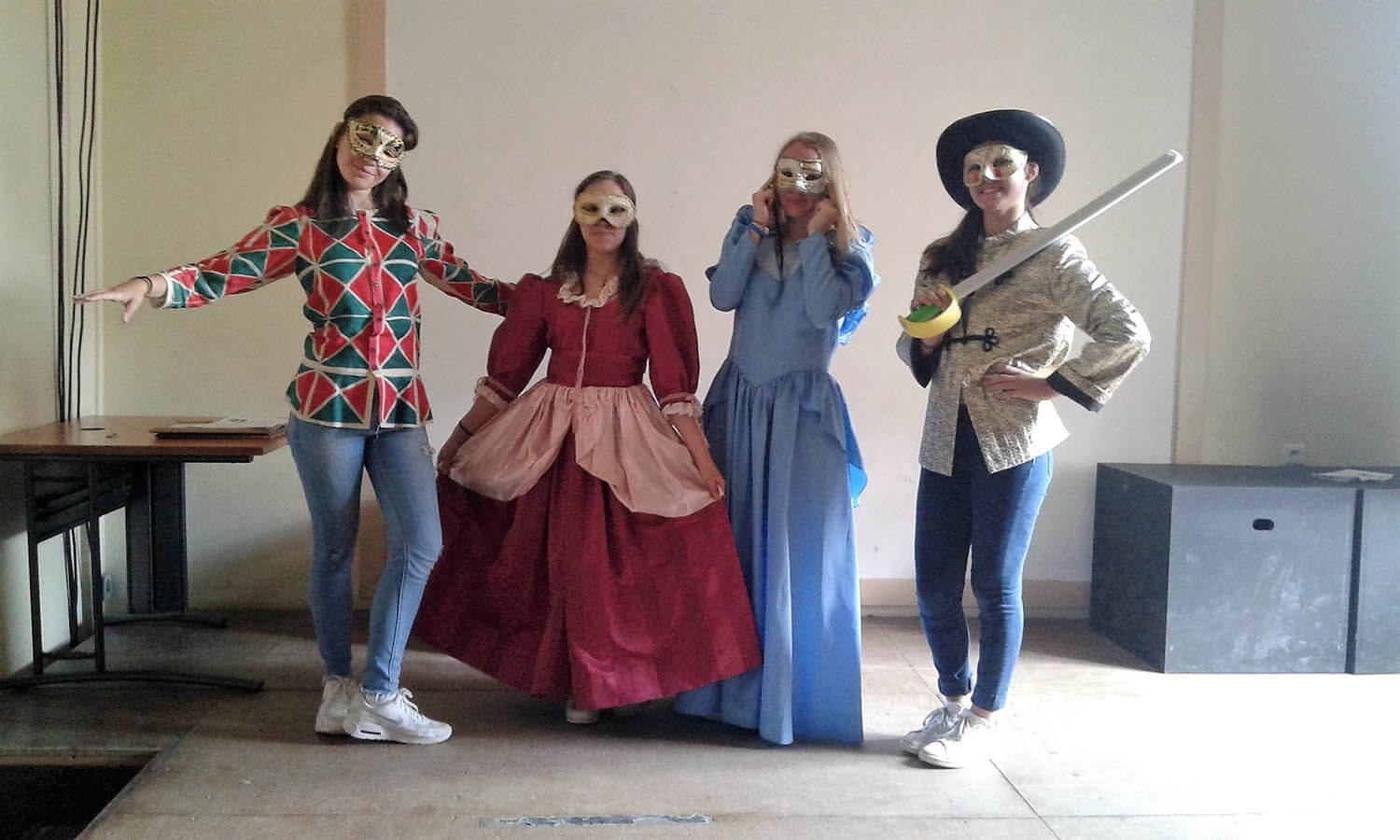 Revêtues des costumes d’Arlecchino, Colombina et Capitano Spaventa, quatre élèves de 3ème ont joué une courte scène en italien devant des élèves de 6ème très attentifs et émerveillés par les jeux de scène, les dialogues et le chant final.