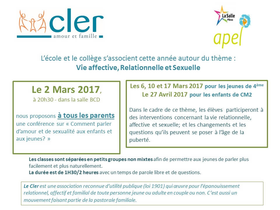 Le 2 Mars 2017 à 20h30, dans la salle BCD de l'école, L'APEL et l'association CLER proposent à tous les parents une conférence sur « Comment parler d’amour et de sexualité aux enfants et aux jeunes? »