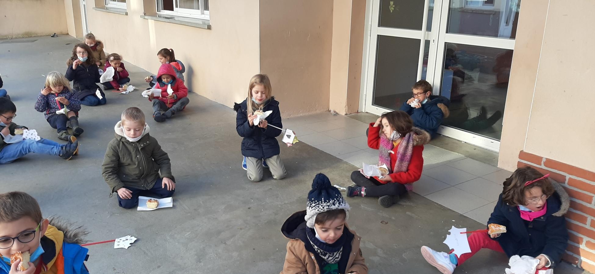 A l 'occasion de la fête de l'épiphanie, les élèves de CP ont eu la chance de déguster une bonne galette. C'est dans la bonne humeur et avec un respect strict du protocole sanitaire que le plus jeune s'est glissé sous la table pour attribuer à chaque camarade sa part de la galette. Après dégustation, nous avons eu un roi et une reine qui ont été acclamés par leurs camarades. Quel plaisir de voir autant de joie dans les yeux des élèves !