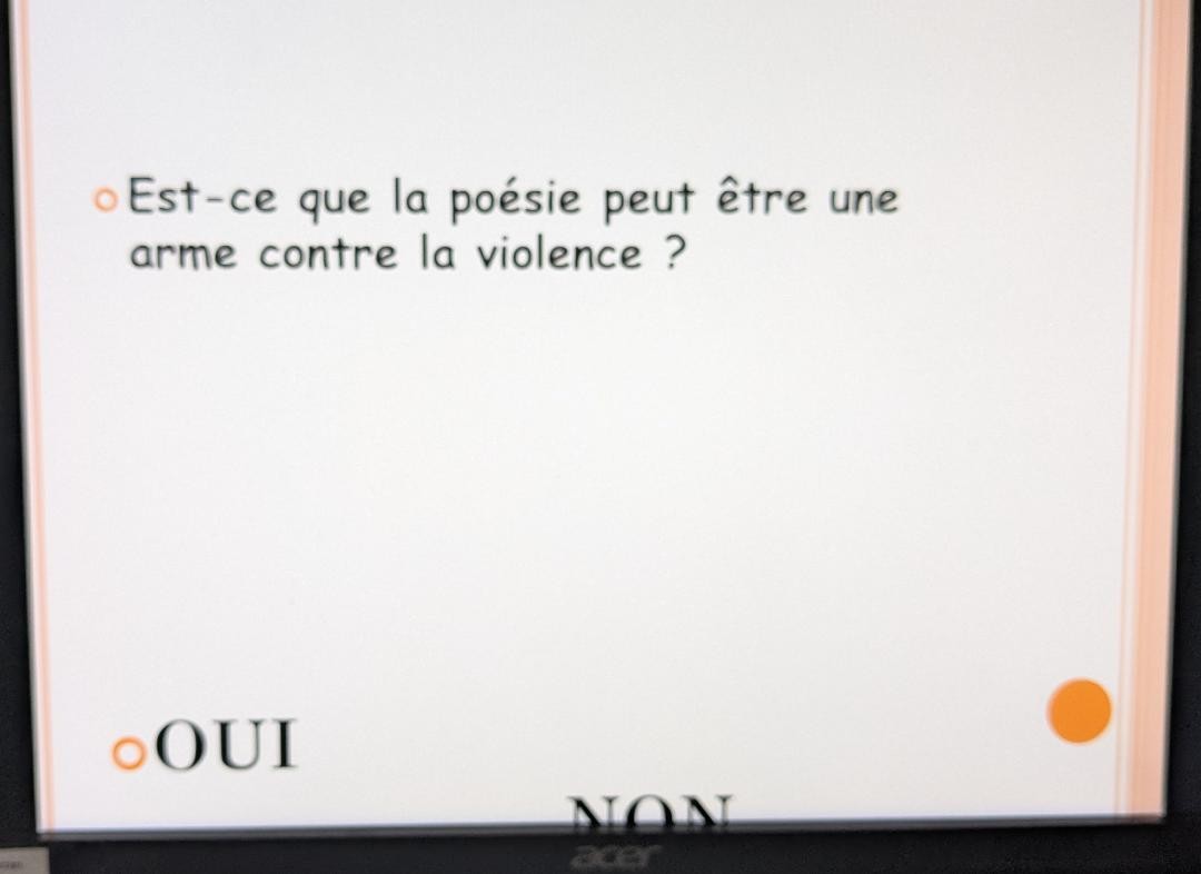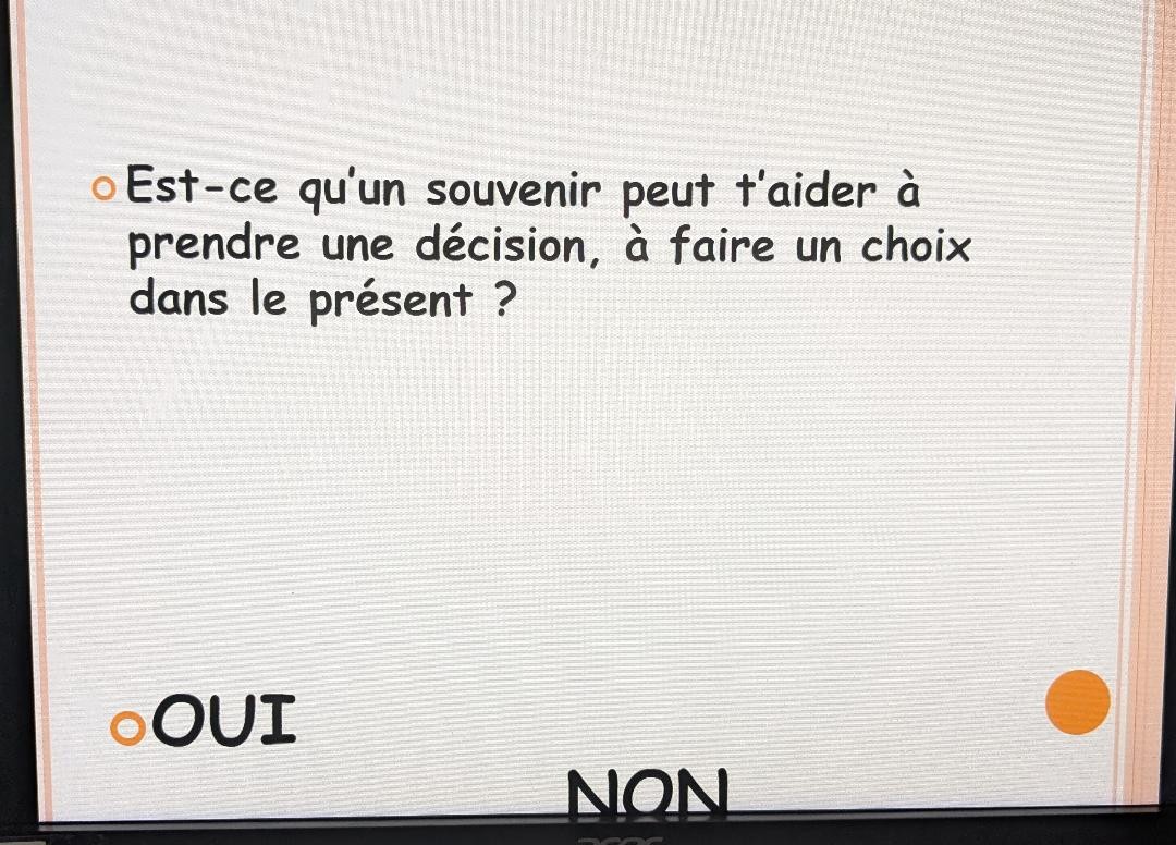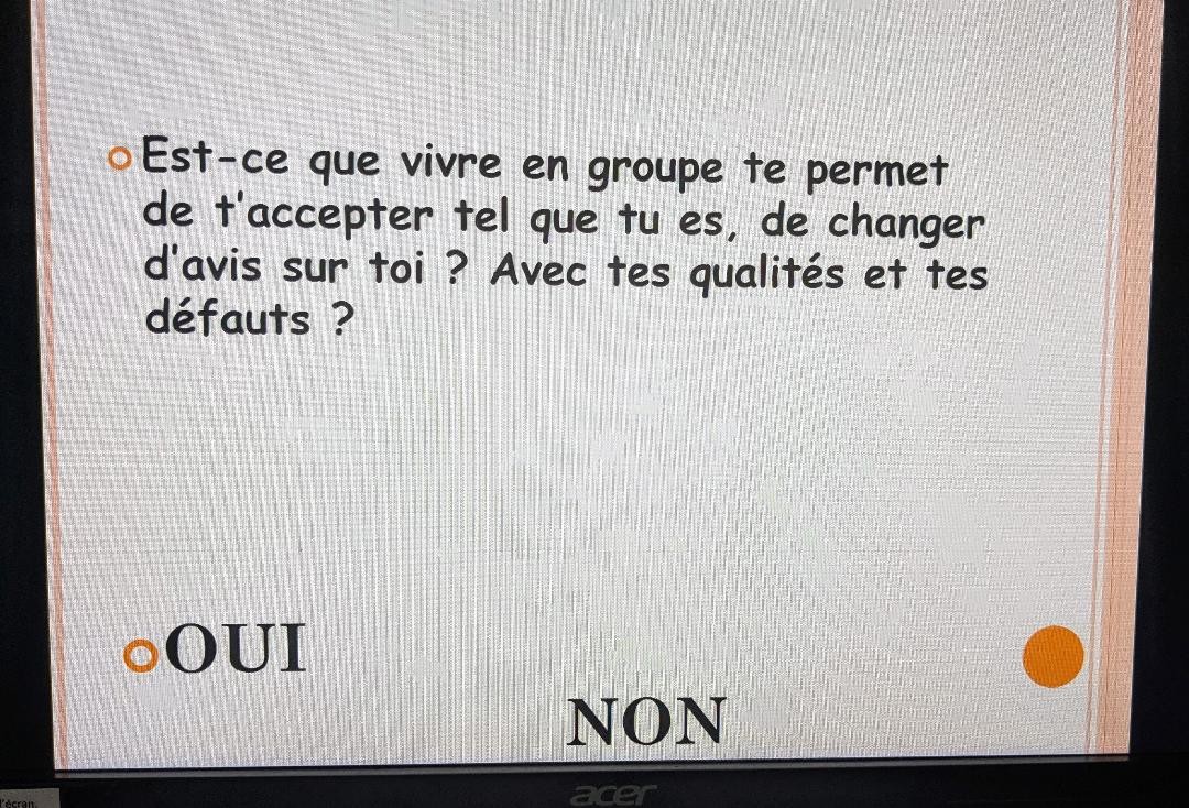 Qu’importe, l’objectif était de convaincre le ou les camarade(s) qui n’avaient pas le même avis sur une question directe posée en développant une argumentation puisée dans ses propres expériences et/ou dans la lecture de certains livres. En se déplaçant physiquement vers un des trois endroits précis dans la salle, l’élève prenait position (« oui » / « non » / « oui et non ») et devait défendre son point de vue.
