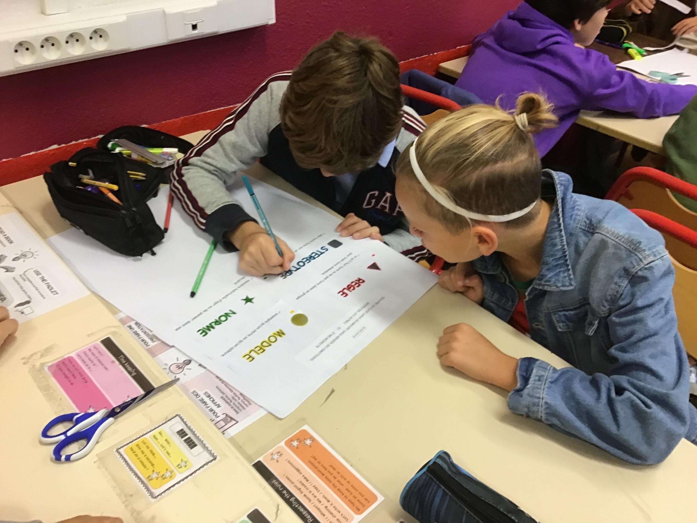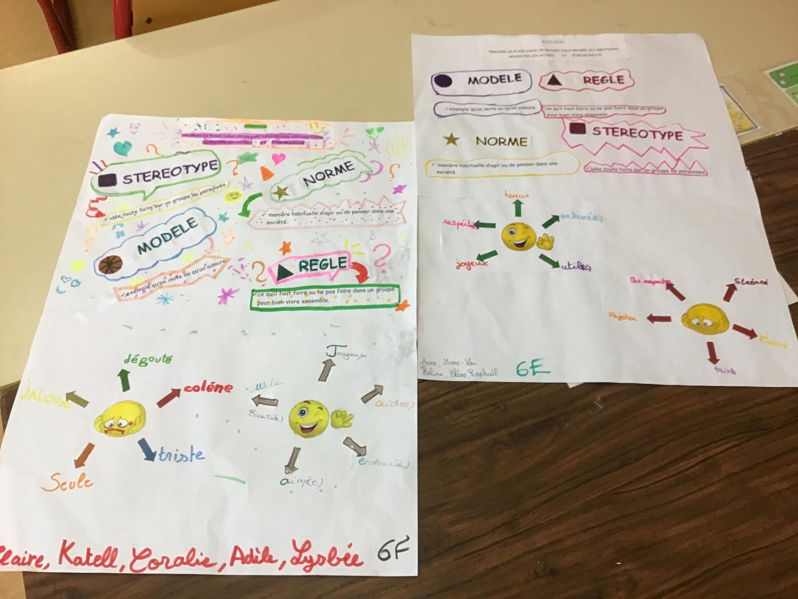 Dans le cadre des nouveaux programmes EVARs ( Eduquer à la Vie Affective et Relationnelle), et en collaboration avec les professeurs de SVT, les 6èmes ont assisté à leur première séance la semaine de la rentrée. En tant que jeune collégien, le thème était : « Trouver sa place dans un groupe sans renier ses émotions, Respecter les autres et Etre respecté ». Au travers d’ateliers, les élèves ont été ainsi invités à réfléchir sur les notions de Règle, Norme, Modèle, Stéréotype en associant ces mots aux bonnes définitions, puis en donnant des exemples précis reposant sur leurs expériences personnelles ou au collège. Dans un second temps, ils ont été amenés à s’interroger sur les émotions de joie ou de tristesse ressenties au sein d’un groupe, d’une classe, … Le trailer du dessin animé « Inside out » ( Vice Versa) est venu illustrer cette thématique des émotions. Tout au long des ateliers, les élèves ont concrétisé leurs réflexions en créant des posters colorés qui pourront être affichés dans les classes. Rendez-vous au 2ème trimestre avec d’autres professeurs pour animer une nouvelle séance EVARs avec un thème différent.