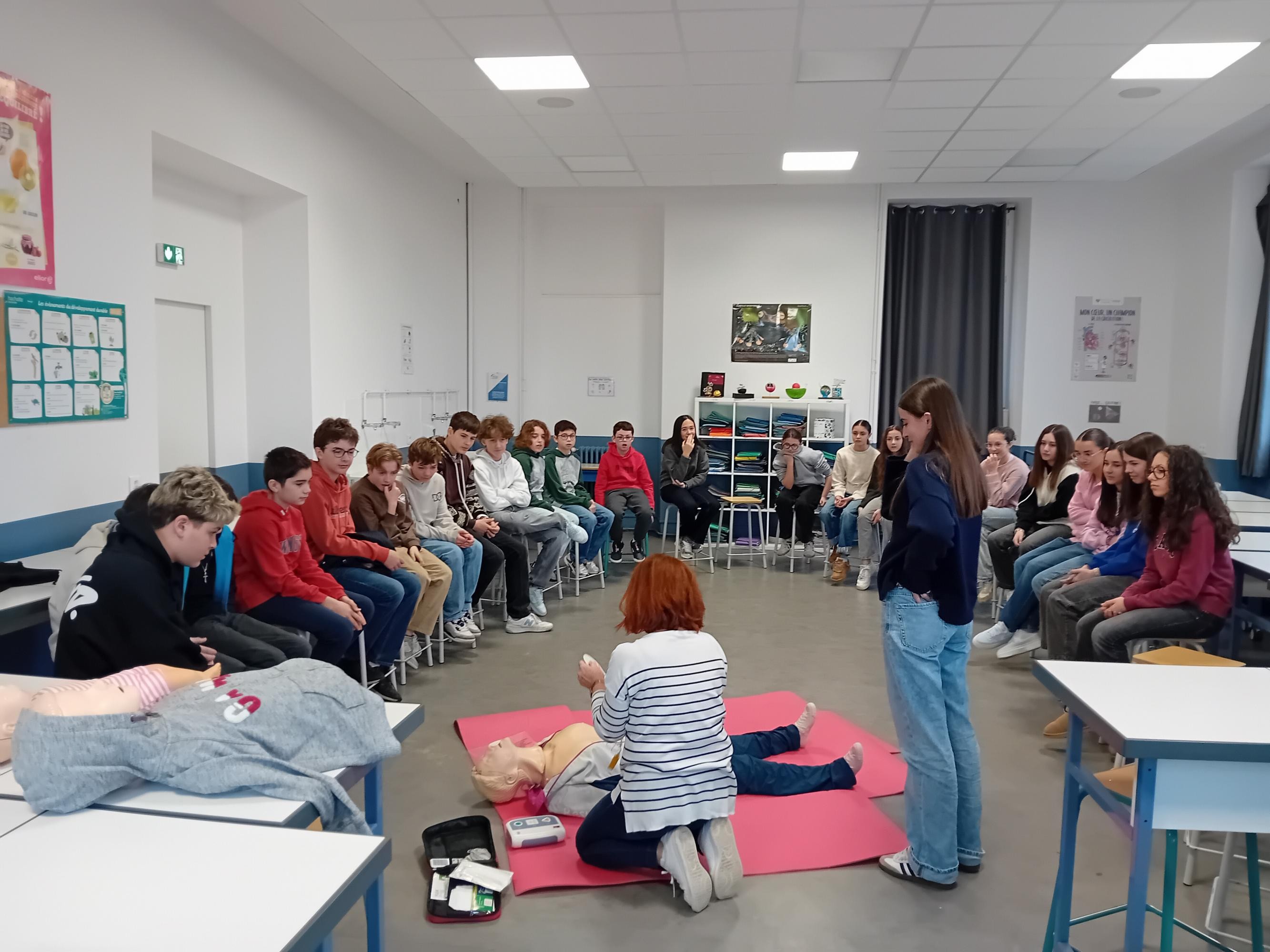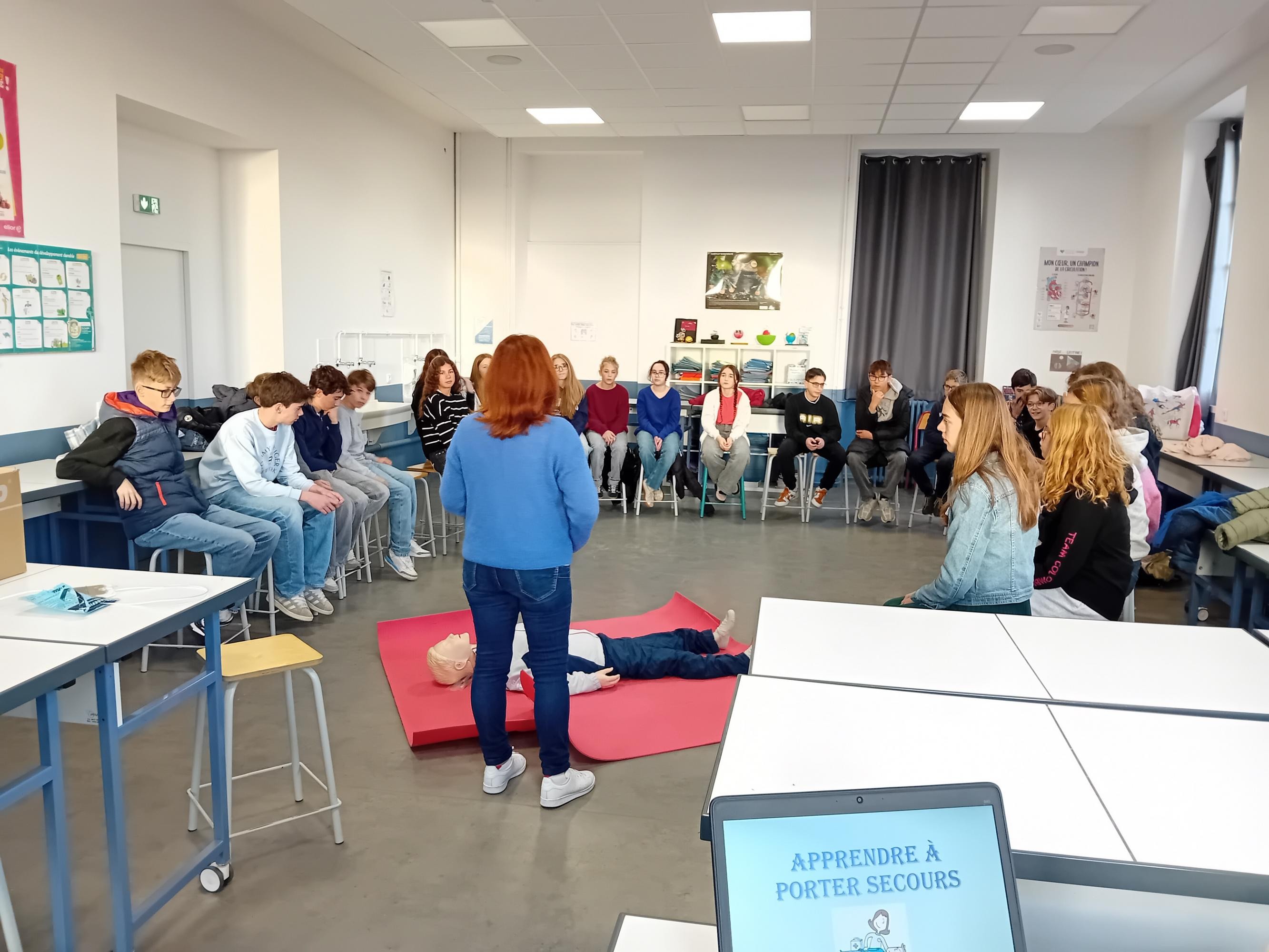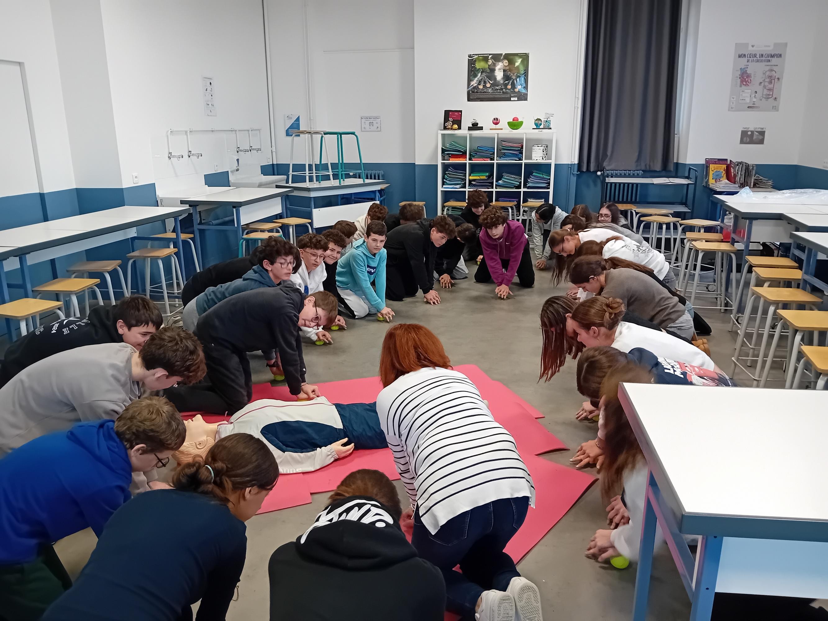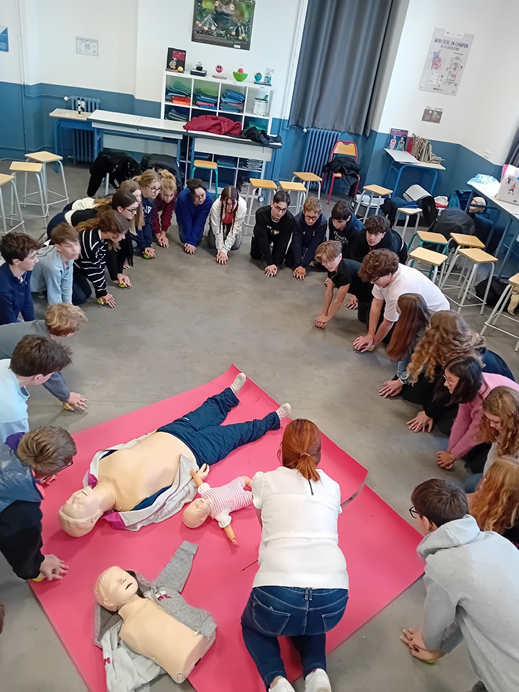 Pour terminer leur cycle de formation aux gestes qui sauvent, tous les élèves de 4è ont participé à l'atelier "Massage cardiaque" avec Véronique Zabotto, formatrice aux Premiers Secours. Les élèves savent désormais repérer si la victime est en arrêt cardio-respiratoire, ils savent passer l'alerte aux services de secours compétents et utiliser un défibrillateur tout en réalisant le massage cardiaque sur la victime. Les élèves se sont entrainés sur des balles de tennis et ont pu constater qu'il fallait beaucoup d'énergie pour réaliser ces gestes qui peuvent sauver des vies. Merci à Véronique pour ces interventions.