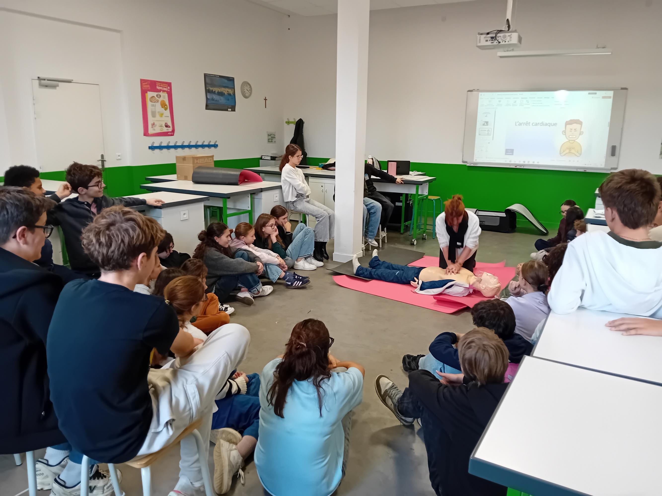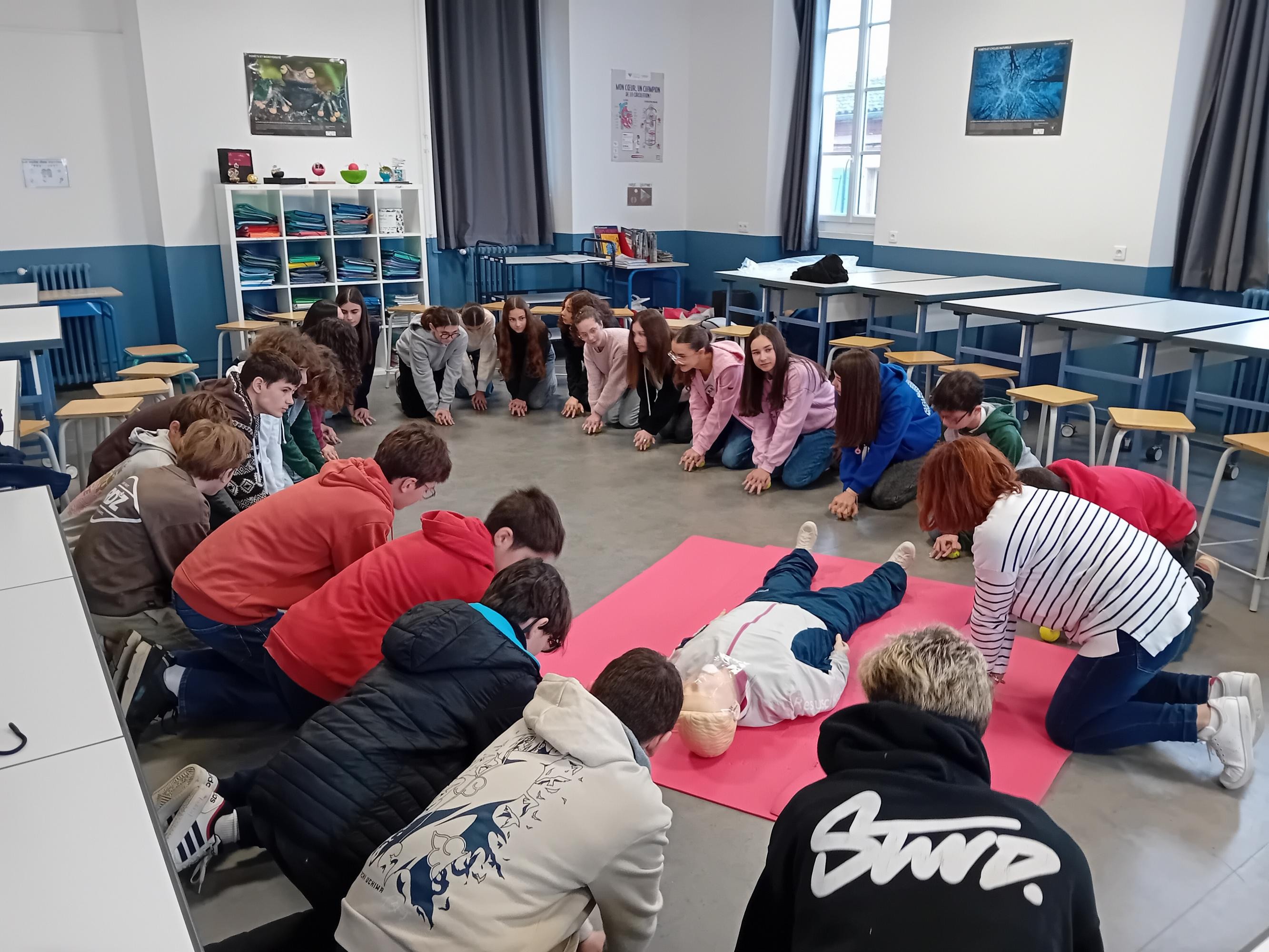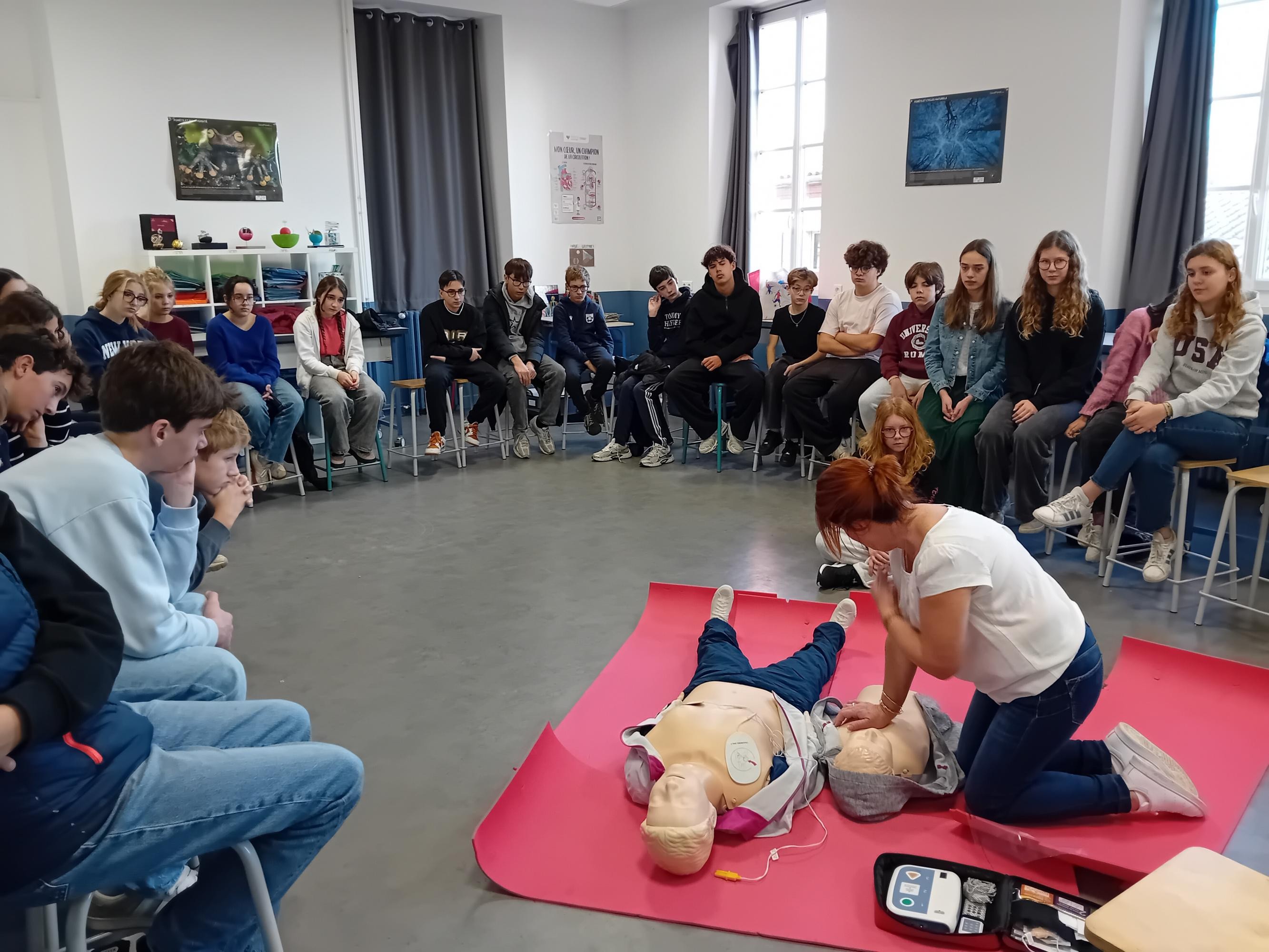 Pour terminer leur cycle de formation aux gestes qui sauvent, tous les élèves de 4è ont participé à l'atelier "Massage cardiaque" avec Véronique Zabotto, formatrice aux Premiers Secours. Les élèves savent désormais repérer si la victime est en arrêt cardio-respiratoire, ils savent passer l'alerte aux services de secours compétents et utiliser un défibrillateur tout en réalisant le massage cardiaque sur la victime. Les élèves se sont entrainés sur des balles de tennis et ont pu constater qu'il fallait beaucoup d'énergie pour réaliser ces gestes qui peuvent sauver des vies. Merci à Véronique pour ces interventions.