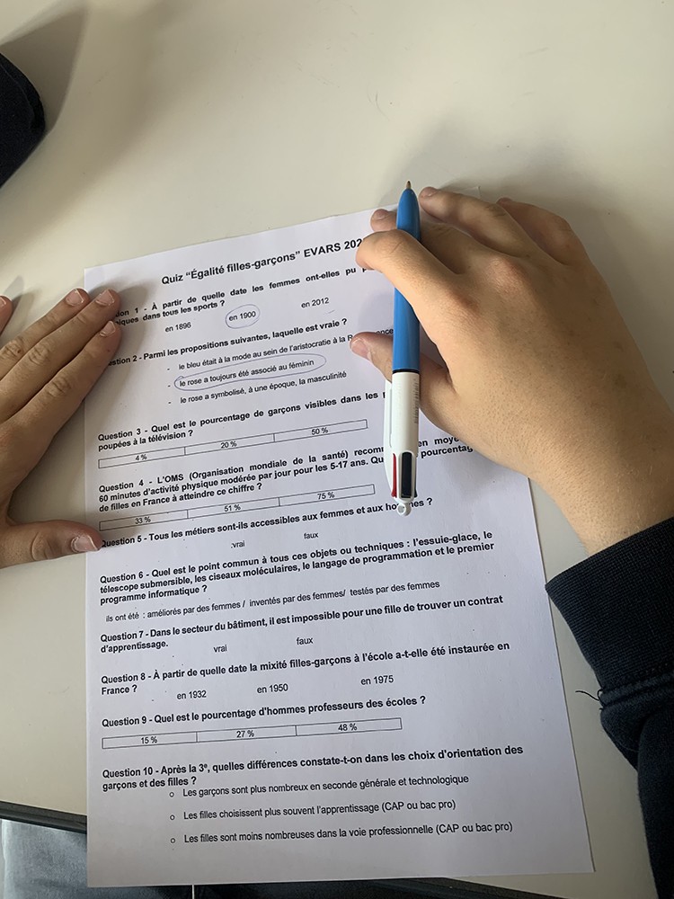 Au cours de ce dernier trimestre, les élèves de 5e ont participé à une séance d’EVARS organisée en deux temps, en lien avec l’axe 3 du programme: « Trouver sa place dans la société, y être libre et responsable ».