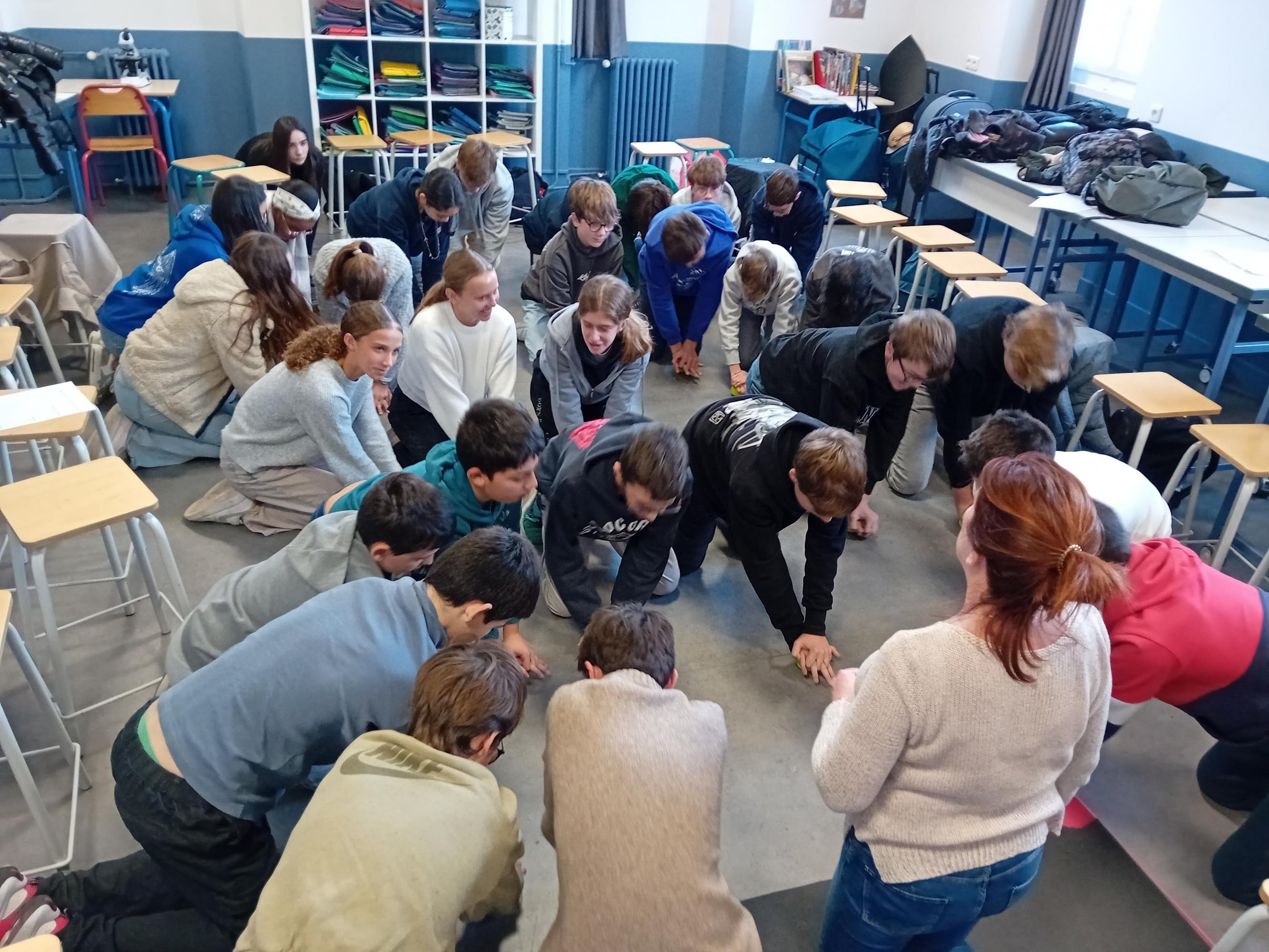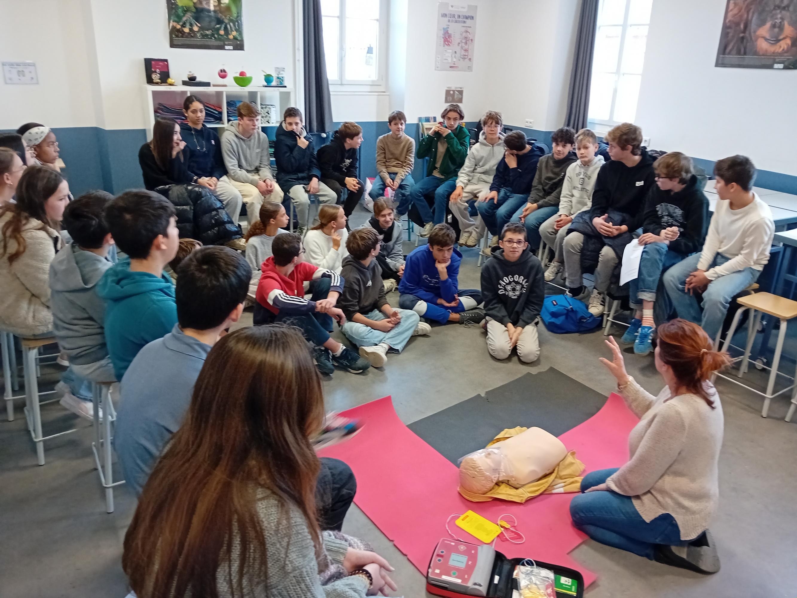 Les élèves de quatrième ont tous suivi une intervention de Véronique Zabotto sur le massage cardiaque. Il savent désormais reconnaître les symptômes d'un arrêt cardio-respiratoire et ont également appris les 3 gestes qui peuvent sauver une vie : appeler, masser et défibriller. Ils ont eu l'occasion de tester le fonctionnement d'un défibrillateur "pédagogique" et d'apprendre les bons gestes pour réaliser un massage cardiaque en s'entrainant sur des balles de tennis.