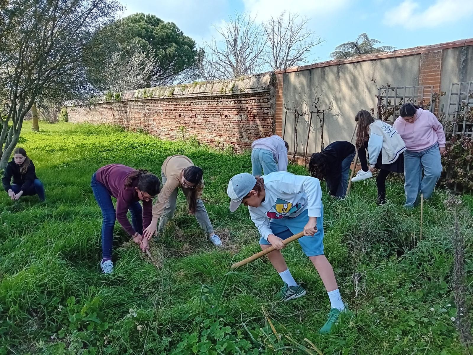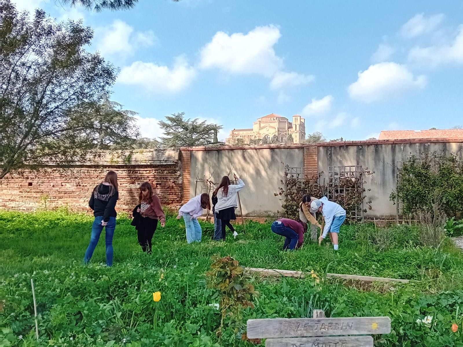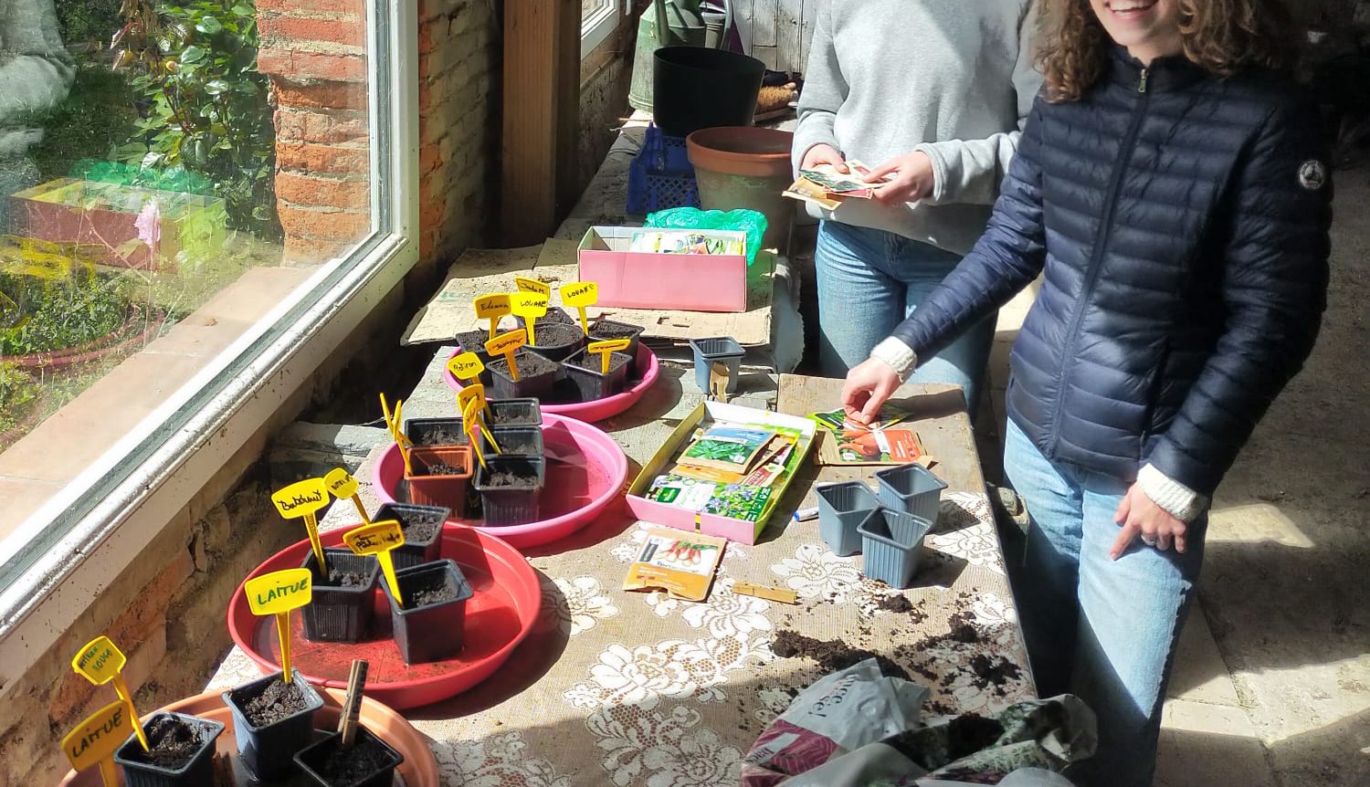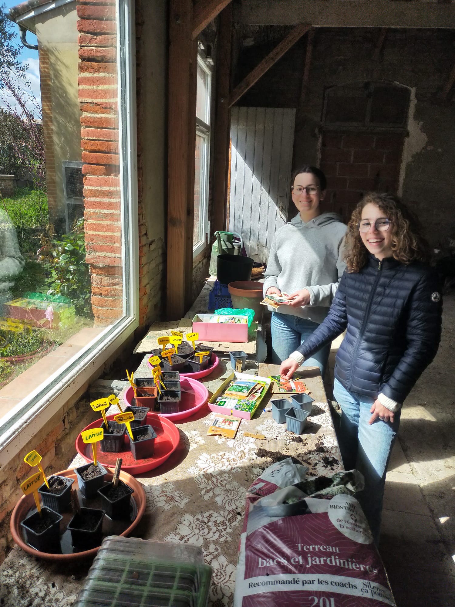 Au programme, découverte de l'espace, désherbage, répartition des zones entre les petits groupes, transfert du matériel, premiers semis de tomates, salades, radis, oignons et bien sûr de courges (potirons, butternuts et potimarrons) pour les futures soupes des maraudes avec les 3e engagés. Les semis ont été installés dans l'orangeraie chez les Frères.