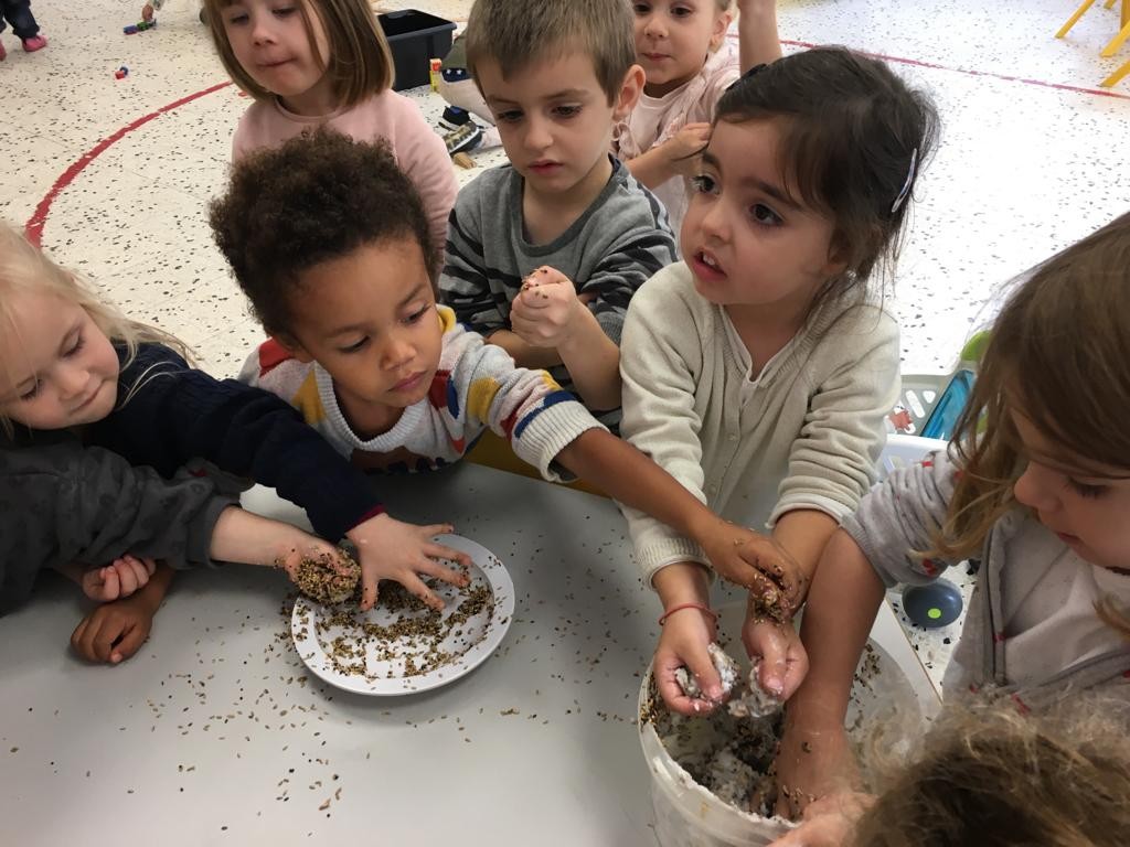 Les élèves de PS ont donc saisi cette occasion pour confectionner des boules de graisse (mélange de graines et de végétaline). Ils sont allés ensuite déposer ces boules sur le terrain du primaire.