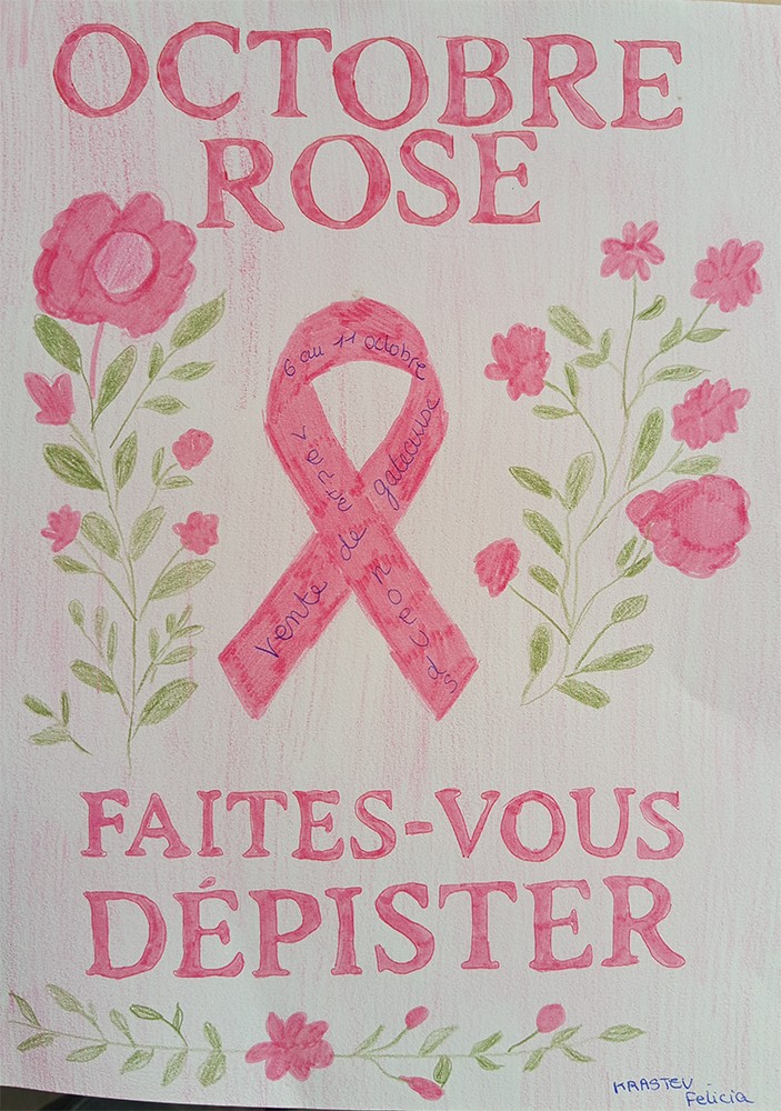 Dans le cadre d’Octobre Rose, les élèves de 3e organisent une vente de gâteaux et de nœuds roses tous les jours pendant les récréations, du lundi 6 au vendredi 10 octobre, afin de soutenir la recherche contre le cancer du sein.