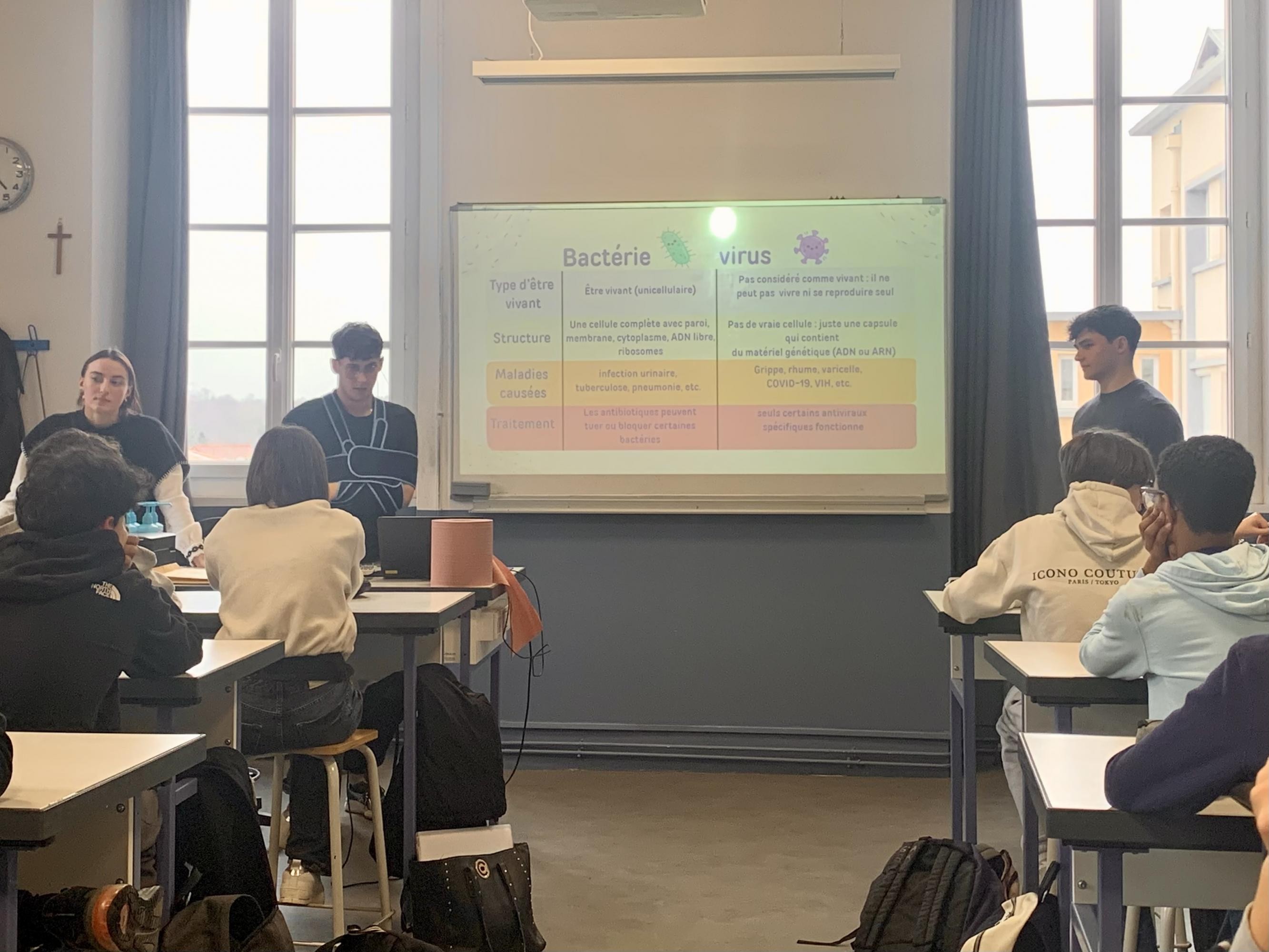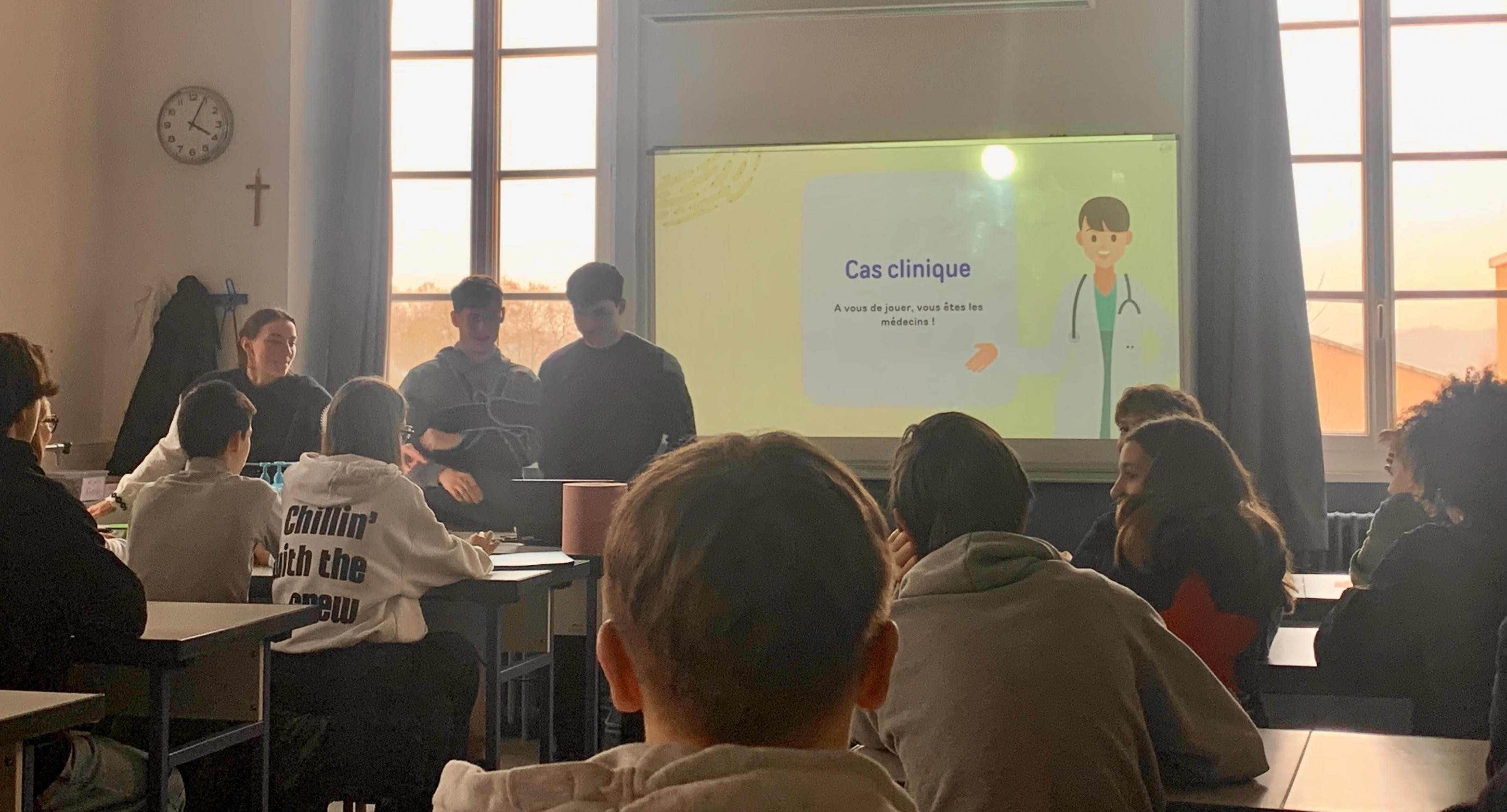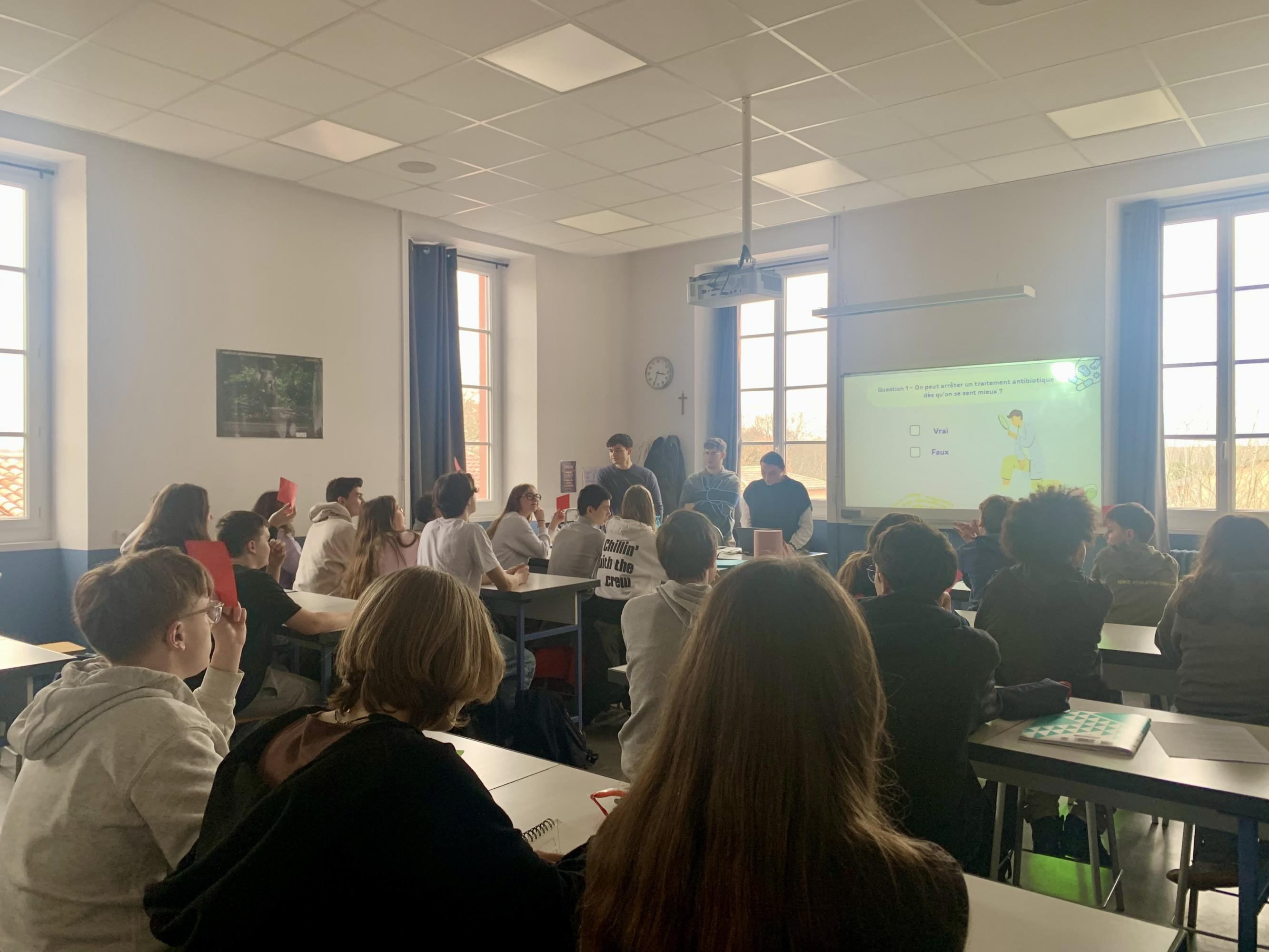 Cette semaine les 3ème ont eu l'occasion de rencontrer des étudiants en santé (futurs médecins, sages-femmes, pharmaciens ou encore infirmiers) dans le cadre de leur service sanitaire. Les élèves ont travaillé sur la prévention des infections et de l’antibiorésistance. Un moment riche en échanges pendant lequel les étudiants ont aussi évoqué leurs parcours après la 3ème et les études dans le domaine de la Santé.