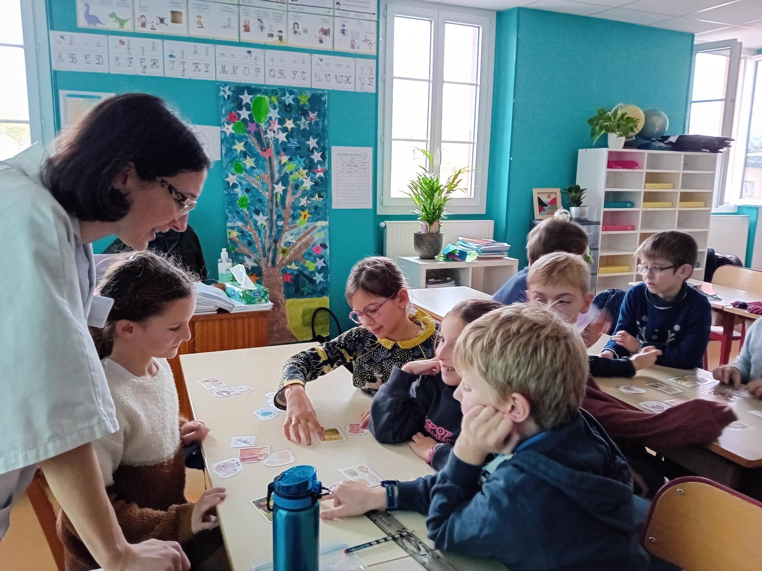 Elle est également intervenue en CE2 pour travailler sur les familles d'aliments, les nutriments et les vitamines sous la forme d'un atelier. Elle en a profité pour apporter des réponses aux questions, nombreuses, que les enfants se posaient sur l'équilibre alimentaire et les quantités.