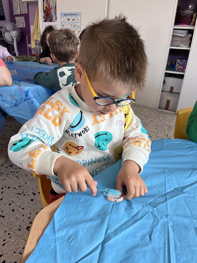 Ce matin, nous avons eu la visite très spéciale d’un papa dentiste et d’une maman orthodontiste venus clôturer notre période de travail sur le thème des dents. Pour l’occasion, ils étaient venus en tenue, avec leurs blouses, leurs masques et tout leur matériel. Les enfants étaient très impressionnés… mais aussi très curieux ! Le but de cette rencontre était de faire disparaître la peur souvent…