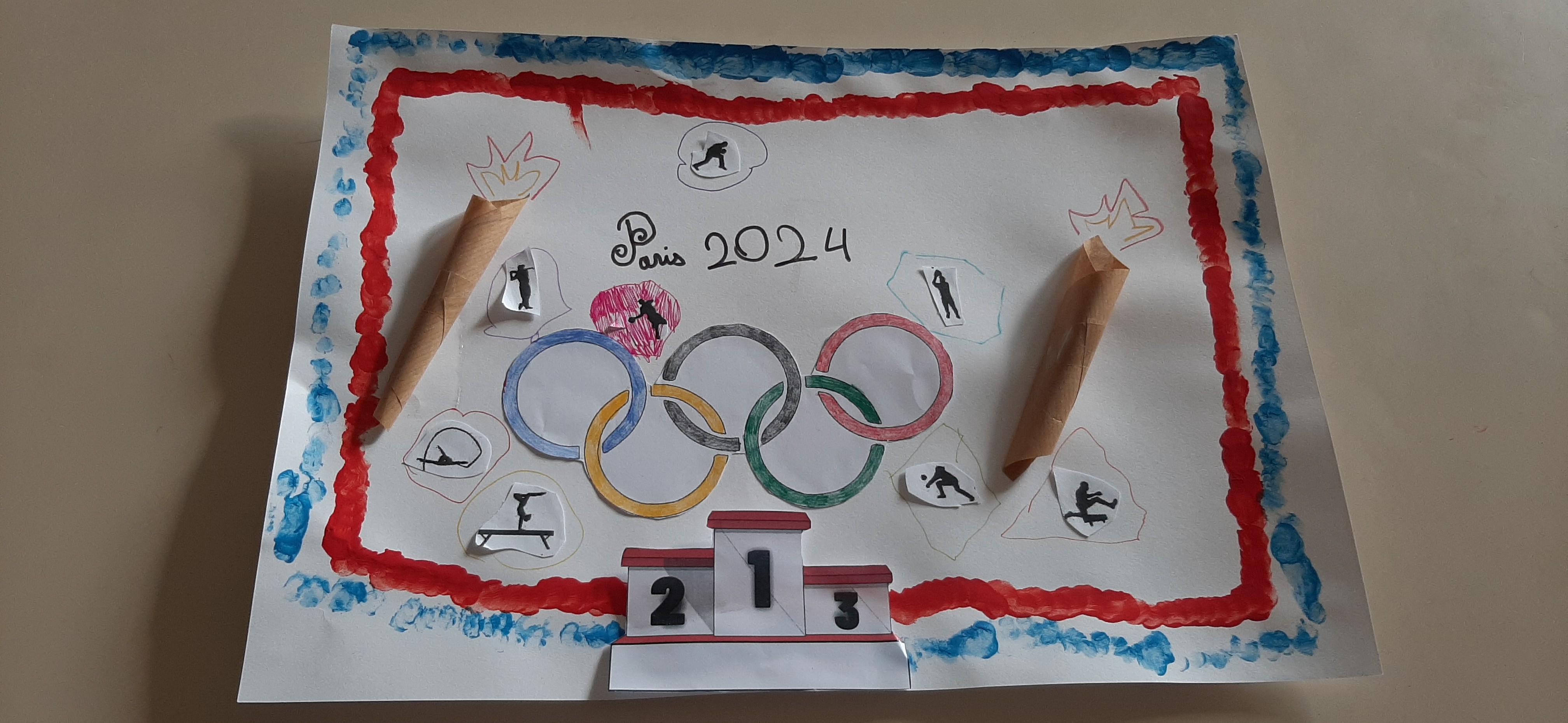 Voici les différentes productions en art visuel, des ateliers menés en CP et CE1 sur le thème des jeux olympiques de Paris 2024.