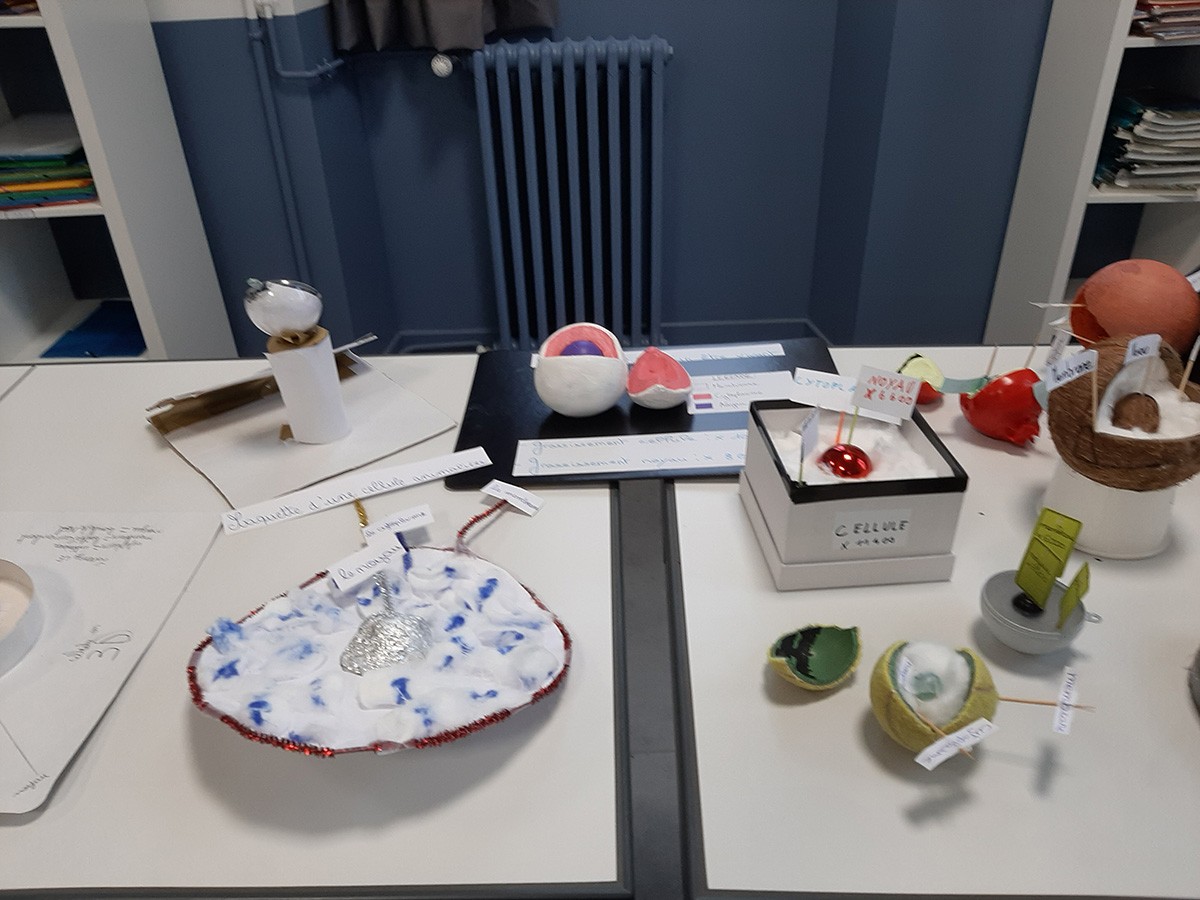 Suite au cours de SVT sur la notion de cellule, les élèves des classes de 6ème D et de 6ème E ont réalisé des maquettes représentant des cellules en 3 dimensions. Ils ont ensuite présenté et exposé leurs maquettes, toutes aussi originales les unes que les autres!