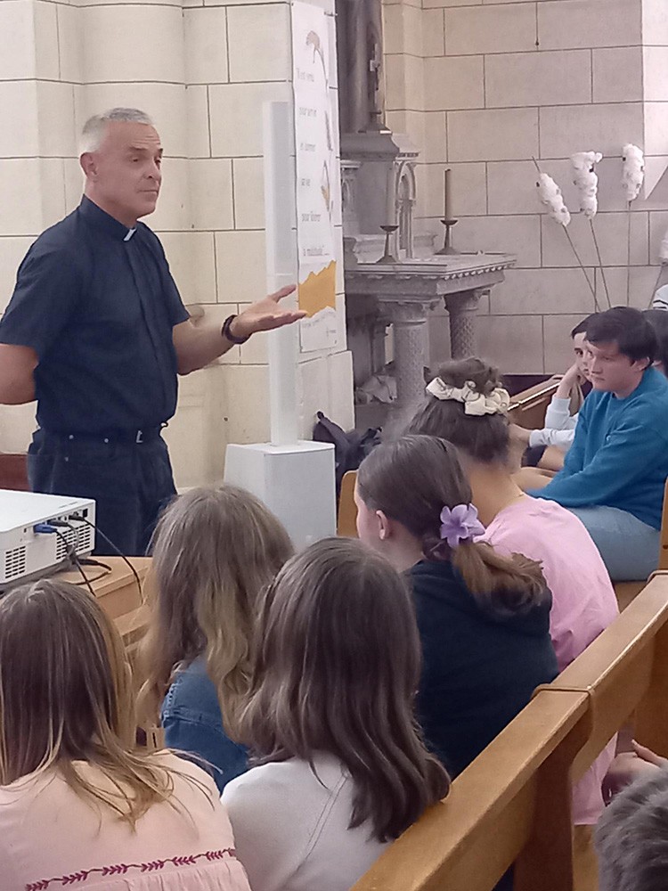 Avec beaucoup de bienveillance, le vicaire général a répondu aux différentes questions des confirmands, portant sur la foi, l’Église, ou encore le sens du sacrement de confirmation. Il a également partagé son propre témoignage de foi et le chemin qui l’a conduit à recevoir les sacrements, notamment celui de l’ordre.